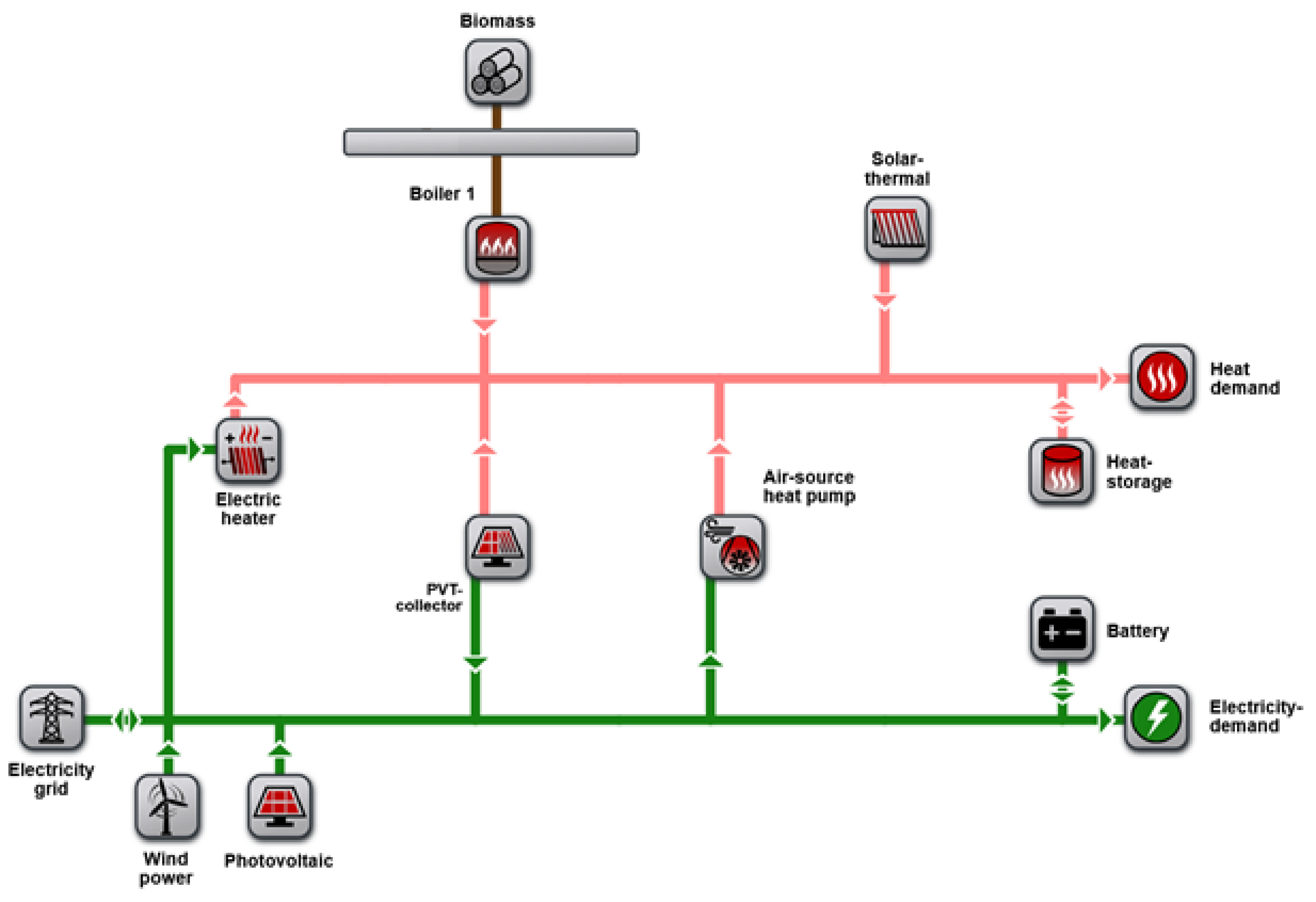 В сформированной структуре можно выделить технологии, используемые для выработки электрической энергии: ветроэнергетические установки (ВЭУ), фотоэлектрические преобразователи (ФЭП), дизель-генераторные установки (ДГУ). Для моделирования ДГУ используется блок Electricity grid, так как такой элемент в nPro отсутствует, но возможность замены предусмотрена и описана в документации. Для выработки тепловой энергии используется электрический котел (КЭ), котел на биомассе (КБ), солнечный коллектор (СК). Гибридный солнечный коллектор (ГСК) позволяет вырабатывать и тепловую, и электрическую энергию. Воздушный тепловой насос (ВТН) вырабатывает тепловую энергию, используя электрическую энергию и низкопотенциальное тепло воздуха. В структурную схему также включены накопитель тепловой энергии (ТН) и аккумуляторные батареи (АКБ).