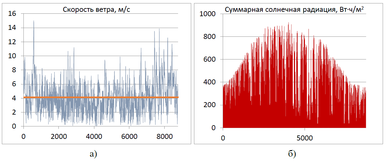 Рис. 4. Данные о потенциале ВИЭ а) скорость ветра на высоте 10 м б) суммарная солнечная радиация, поступающая на горизонтальную поверхность