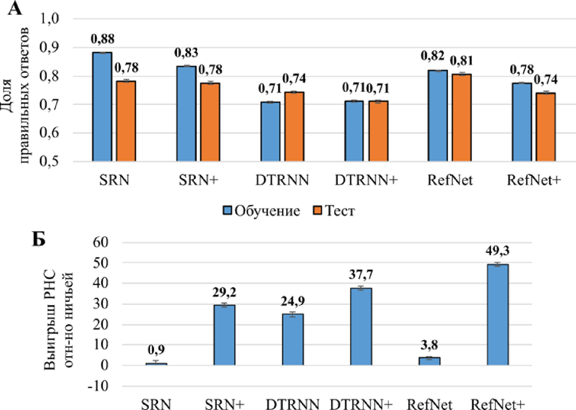 На рис. 2А представлены результаты. Наилучшие показатели при обучении продемонстрировали гомогенные РНС: SRN (средняя доля правильных откликов 0,88) и SRN+ (0,83). Для них же характерно наибольшее снижение доли правильных ответов при тестировании. В режиме теста наибольшая средняя доля правильных ответов у гетерогенных РНС RefNet (0,81).