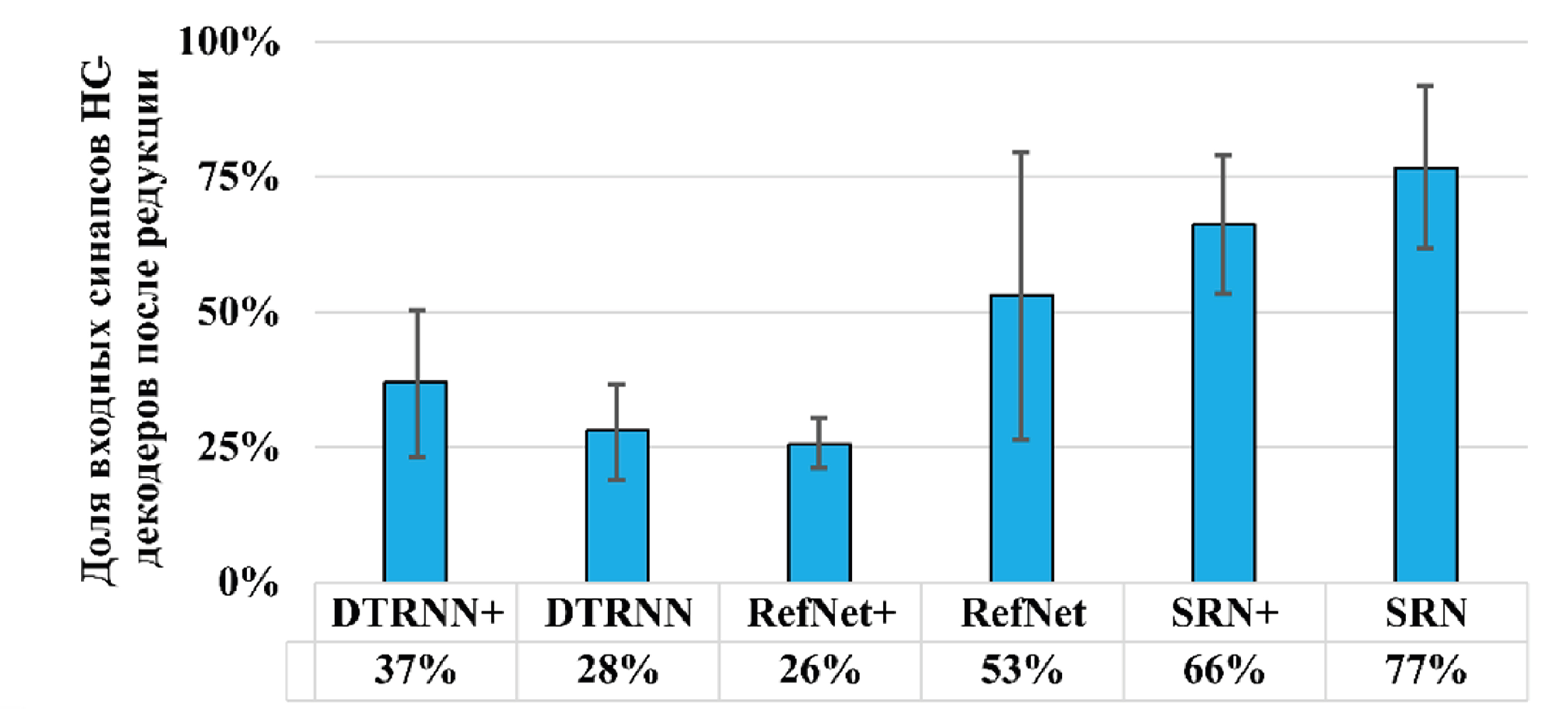 Наконец, важно отметить, что паттерны нейронной активности даже в пределах РНС одного типа очень вариативны по сложности, о чем можно судить по величине стандартного отклонения на рис. 4. Так, НС-декодер одной сети типа RefNet может редуцироваться на 70-80%, а другой – ни на один синапс.