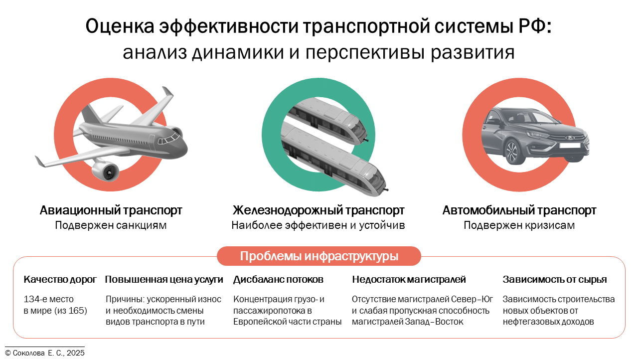 Results. Overall, the Russian transport system meets domestic demand for transportation services. Exports of such services are limited not so much by the length of routes and the resulting high cost of transportation, but by the inefficiency of the system itself. Railroads remain the most efficient, while road and air transport are subject to sanctions and risks. The need for a new financing system for the development of Russia's transport system, based on the allocation of surplus revenues and their investment in transport development, is justified. It is proven that the potential efficiency of the Russian transport system is not being fully utilized.