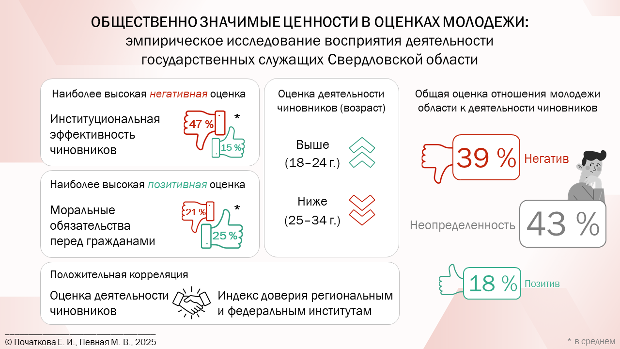 Materials and Methods. The empirical basis for the study was data from a questionnaire survey of young people in a large region of Russia – the Sverdlovsk Region – conducted in 2023 (quota sample, n = 320). Respondents were asked to answer 15 questions about the activities of local officials. The data was analyzed using descriptive statistics and Spearman's correlation analysis.