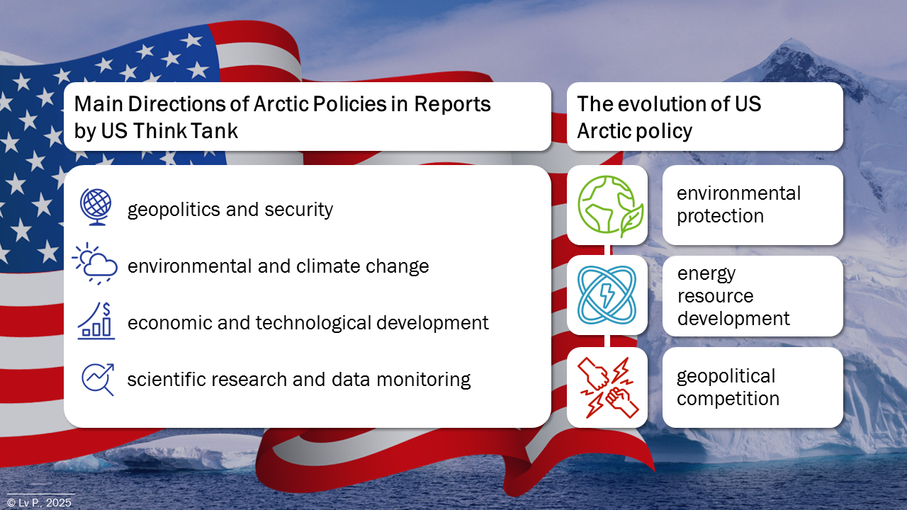 Results. The main topics of reports on US Arctic policy focus on four areas: geopolitics and security, environmental and climate change, economic and technological development, and scientific research and data monitoring. Dynamic thematic modeling further revealed the evolution of Arctic policy and reports by US think tanks, which went through stages of transition from environmental protection to energy resource development and then to geopolitical competition.