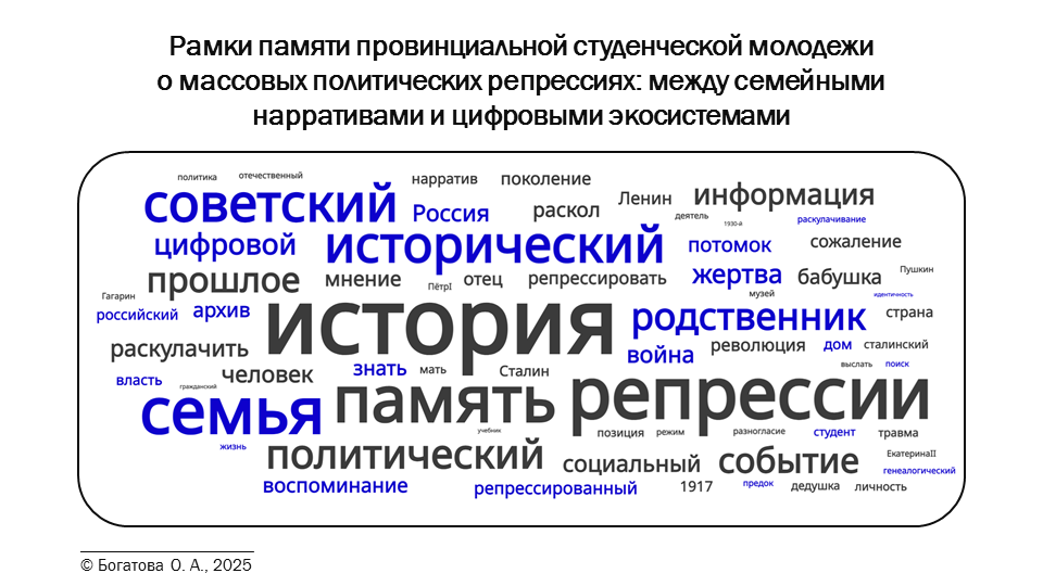 Results. The main sources (including oral recollections of family members, textbooks, artistic and popular science films and literature, traditional and digital archives, thematic websites) and technologies for accessing information about mass political repression have been identified. It has been shown that, when motivated, students use neurosearch, digital archives, and genealogical websites (MyHeritage, Geni.com) to fill in gaps in their knowledge about their family's past. Forms of incorporating family memories into the public narrative (local history competitions, publications, museums) have been identified. The typological characteristics of the mnemonic behavior of centenarians are defined: pluralistic agonism or avoidance of mnemonic conflicts. The mode of communication about the Soviet past is characterized as pluralistic and pillarized, generally corresponding to the dominant historical narrative, which condemns political repression but avoids assessments of the Soviet period as a whole. The prevailing methods of managing the content and structure of family memory about repression are revealed: individualization of family history, historicization in the form of deactualization or meta-historical reflection, and the construction of one's own narrative of national history (among history students).