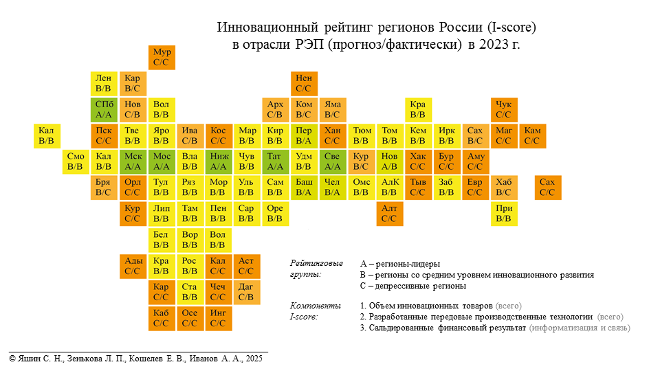 Results. The verification confirmed the model's practical applicability: the accuracy of the integral I-score rating prediction on new data was 81.93 %. Based on the approbation results, a current map of innovative ratings was constructed. The leading regions (A) in 2023 were the Moscow Region, Moscow, St. Petersburg, Republic of Tatarstan, Nizhny Novgorod Region, and Sverdlovsk Region. Analysis of discrepancies between prediction and fact revealed growth potential for Novosibirsk Region and potential risks to the leading positions of Republic of Bashkortostan, Perm Territory, and Chelyabinsk Region.