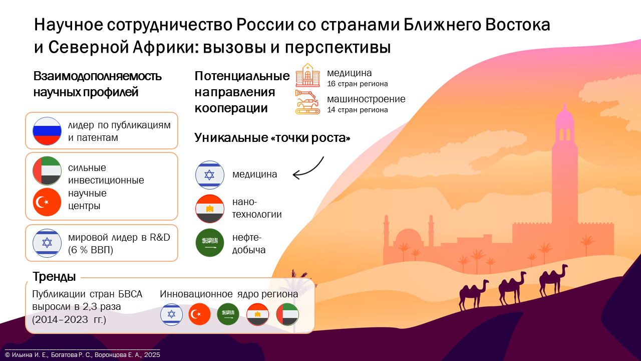 Results. The study found that MENA countries and Russia have potentially complementary scientific and technological profiles. Trends in scientific research in the Middle East and North Africa were characterized. Potential opportunities for cooperation were identified – in oil extraction with Saudi Arabia, in medicine with Israel, and in nanotechnology with Egypt. Promising areas for Russia’s cooperation with MENA countries include medicine (across 16 countries) and mechanical engineering (across 14 countries)
