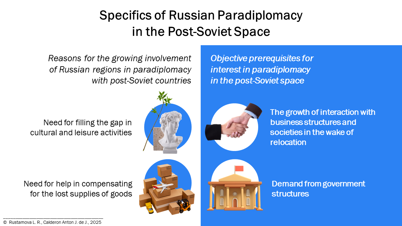 Results. It has been revealed that the transition of the regions from solving purely practical development issues within the framework of a paradigm shift to participating in integration projects began after the growing interdependence required progressive movement towards the introduction of further mechanisms for the freedom of movement of people, goods and services. After 2022, the regions became more actively involved in paradiplomacy with the countries of the former Soviet Union, because they could help compensate for the lost supplies of goods, as well as fill the gap in cultural and leisure activities. It is determined that the objective prerequisites for interest in paradiplomacy in the post-Soviet space were the growth of interaction with business structures and societies in the wake of relocation, as well as demand from government structures.