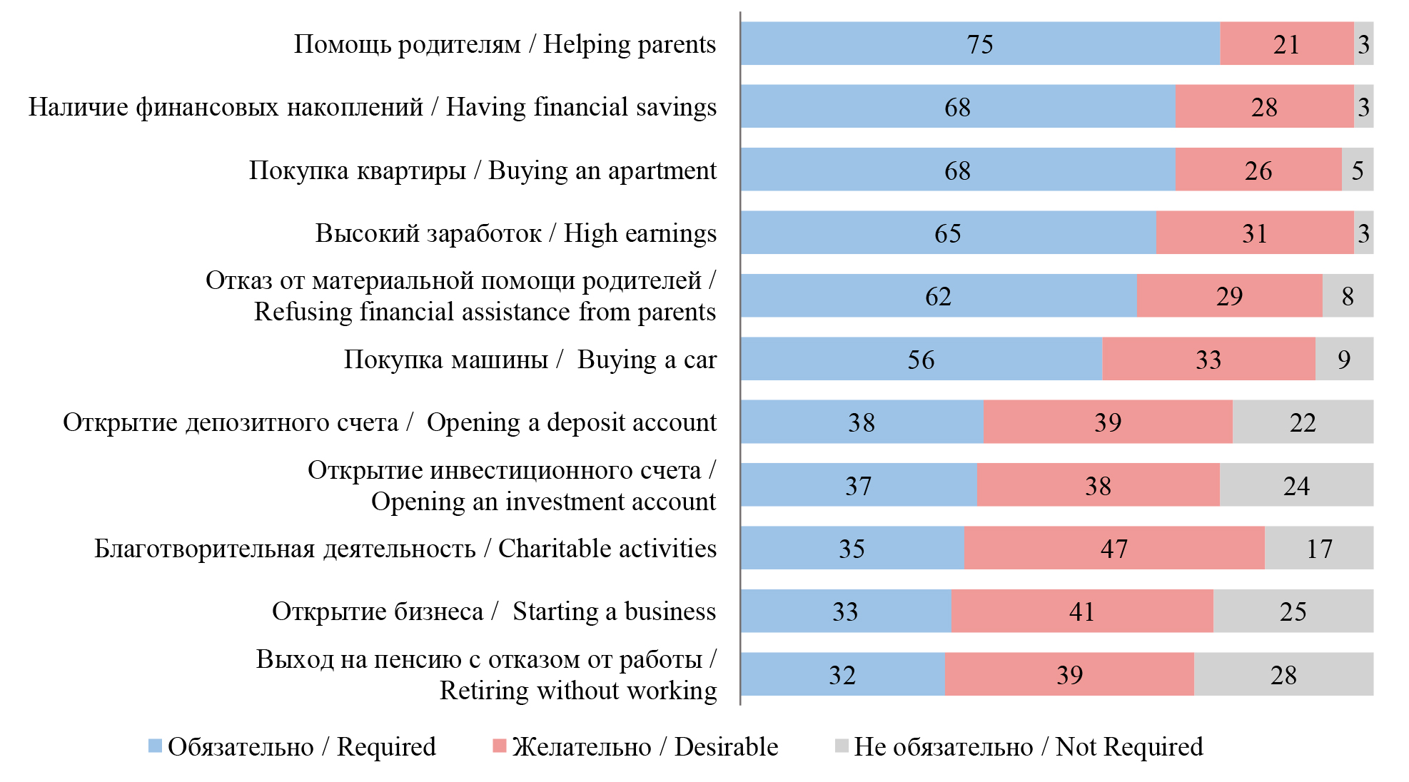 Жизненные планы для каждой стратегии установлены исходя из ключевых жизненных ориентиров молодежи. Вопросы, касающиеся жизненного планирования, были даны в табличной форме с обязательной оценкой каждого выбора по шкале «обязательно», «желательно», «не обязательно». Инструкция к вопросу звучала следующим образом: «Насколько важно для вас в будущем предпринять следующие шаги, где “обязательно” значит, что Вы не будете считать себя состоявшимся в жизни без выполнения этого условия (если Вы уже реализовали какие-то из предложенных вариантов, отметьте их как обязательные)».