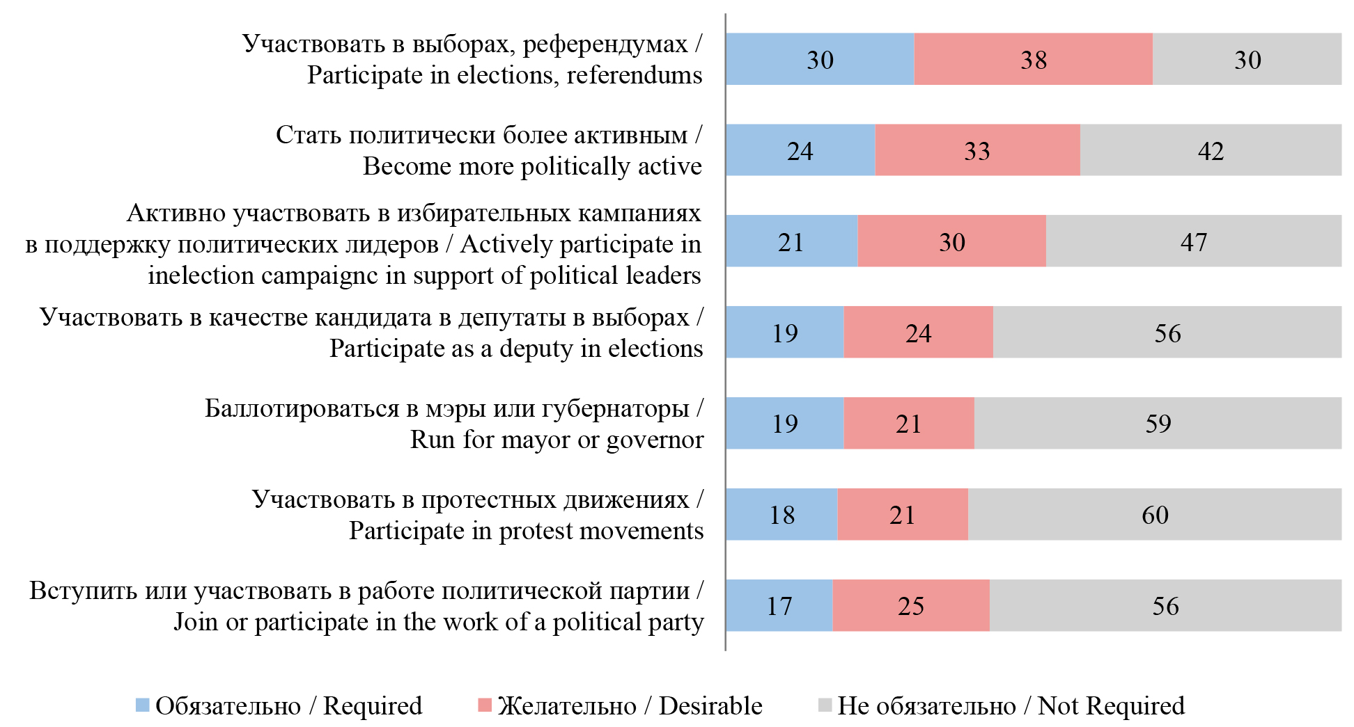 Жизненные планы в рамках политических стратегий не настолько обязательны для молодых людей – политические стратегии становятся скорее элитарным выбором, а в условии преобладания эгоцентричных и инфантильных характеристик в политическом мышлении, можно сказать, что региональная молодежь скорее избегает активного включения в данные стратегии [38]. Даже участие в выборах является обязательным только для 30 % молодежи. Решения, связанные с личной политической вовлеченностью (политическая карьера депутата, губернатора, мэра), интересны для 19 % молодежи – это говорит о высоких политических амбициях (рис. 2). Конечно, ранги таких решений невысоки, но, учитывая низкую востребованность «политических карьеристов», такой показатель можно считать достаточно высоким.