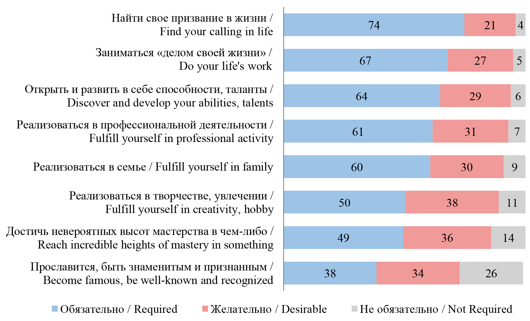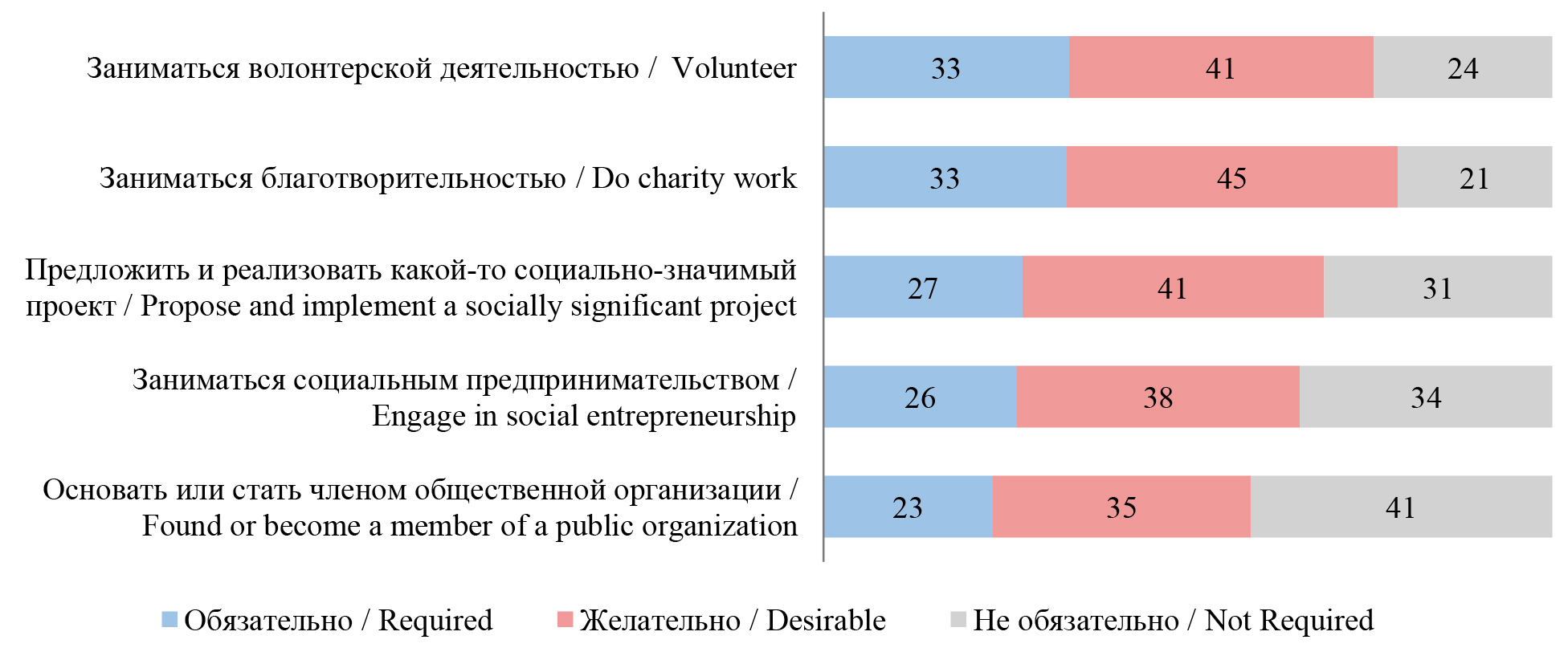 Жизненные планы, связанные с общественными стратегиями, являются обязательными как минимум для четверти молодежи (особенно в части волонтерства и благотворительности, в которых заинтересован каждый третий молодой человек) (рис. 3). Новыми жизненными ориентирами, предлагаемыми как варианты выбора, в этом году в мониторинге стали возможность социального предпринимательства (такой вариант жизненного плана как обязательный ставят для себя 26 %) и реализации социально-значимого проекта (его для себя важным считают 27 %).
