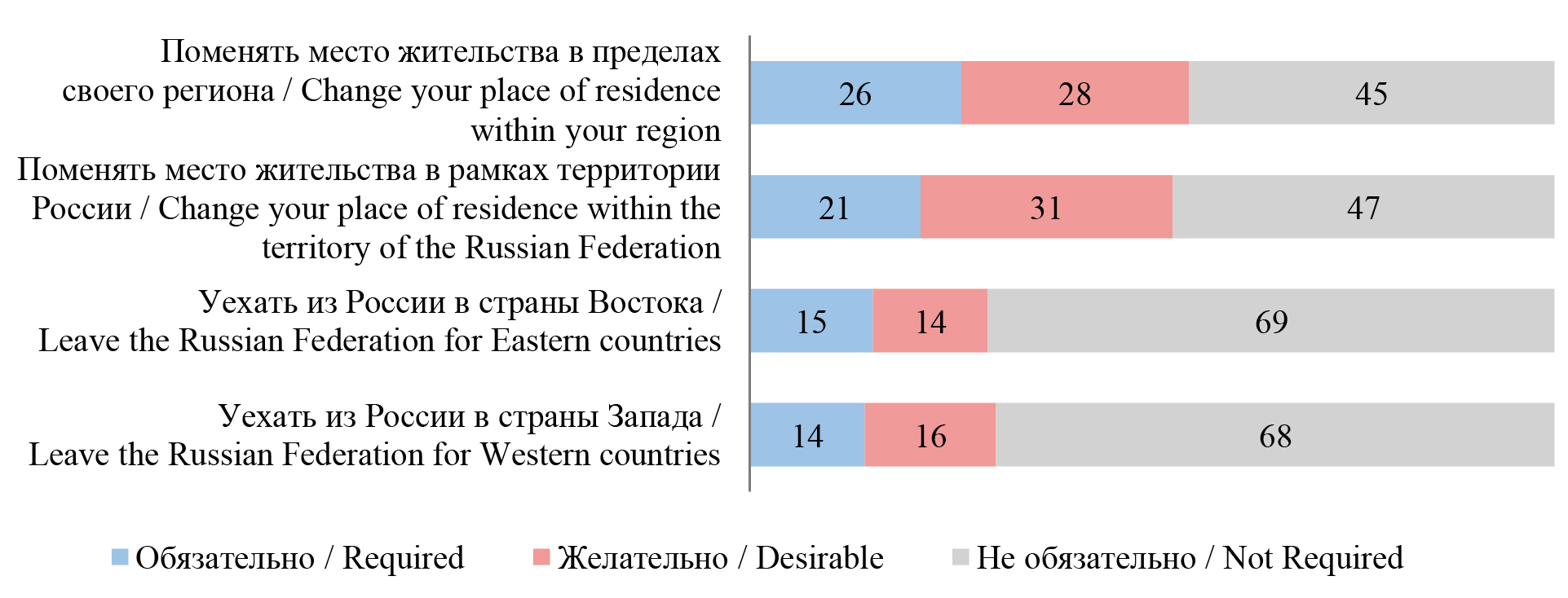 В свои миграционные планы включают желание переместится в пределах своего региона 26 % молодежи, такая ситуация объяснима в том числе и с точки зрения безопасности: молодые люди вынуждены переезжать из приграничных зон на более безопасные территории. Как обязательный миграционный выбор для себя изменить место жительство по территории России указали 21 %. В случае острой обстановки с выездом молодежи из провинциальных регионов важное значение имеет и ответ «желательно», который дали 31 % респондентов (рис. 6).