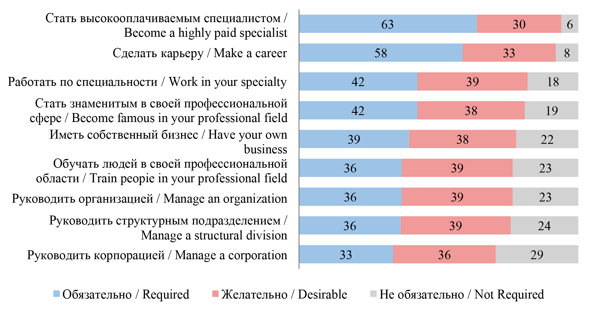 Жизненные стратегии относительно карьеры для большинства молодежи связаны с поиском рабочих мест с высокой заработной платой и возможностью карьерного роста, важным для образовательной системы можно считать то, что 42 % устремлены на работу по специальности. Есть и определенные амбициозные планы – 42 % молодых людей хотели бы стать знаменитыми в своей профессиональной сфере (рис. 7), а 33‒39 % связывают свое будущее с весомыми профессиональными и карьерными достижениями, в том числе в плане руководящей деятельности – открытие собственного бизнеса, руководство экономическими субъектами и подразделениями.
