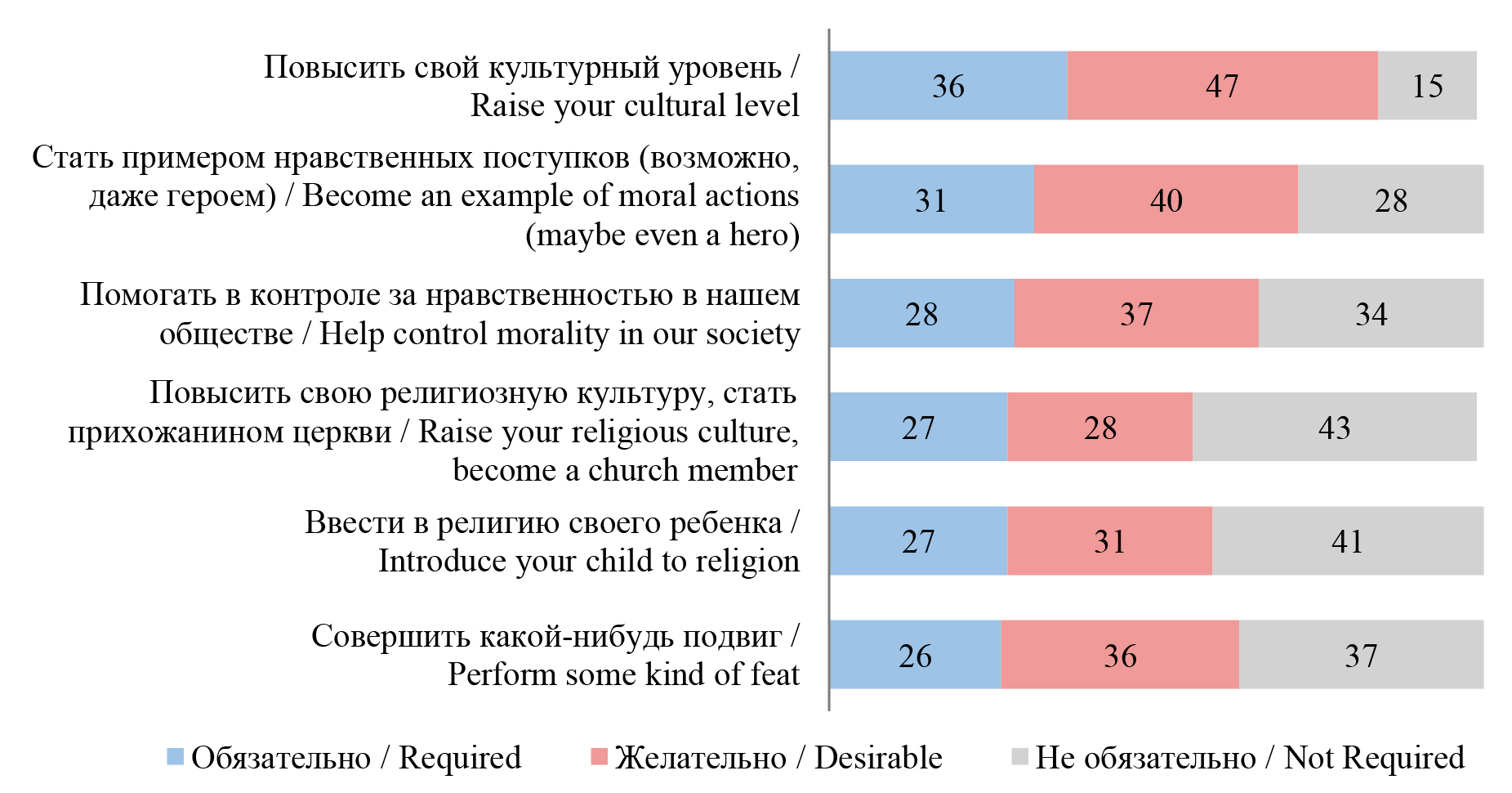 Для верификации возможных жизненных планов молодежи по данной стратегии были предложены различные решения, связанные с нравственным и духовным ростом и проявлением. Так, обязательным в своей жизни 36 % респондентов считают повысить свой культурный уровень, 31 % хотели бы стать примером нравственных поступков. Все остальные выборы в равной степени характерны для групп от 26 до 28 % – надо сказать, что по сравнению с прошлым годом важность нравственных жизненных ориентиров повысилась. Так, например, совершить подвиг, что актуально в современной ситуации региона, могли бы 26 % (в 2022 г. ‒ 21 %) (рис. 8).