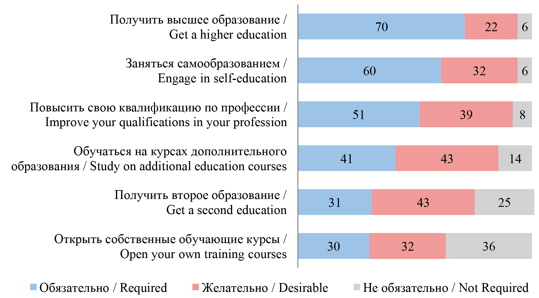 Жизненные выборы молодежи в рамках образовательных стратегий связаны прежде всего с обязательным желанием получить высшее образование и заниматься самообразованием (рис. 9). 31 % опрошенных в качестве обязательных действий указали получение второго высшего образования. Стоит отметить, что жизненные выборы в образовательных стратегиях дают небольшой показатель альтернативной отметки «не обязательно», что показывает их приоритет в жизненном планировании.