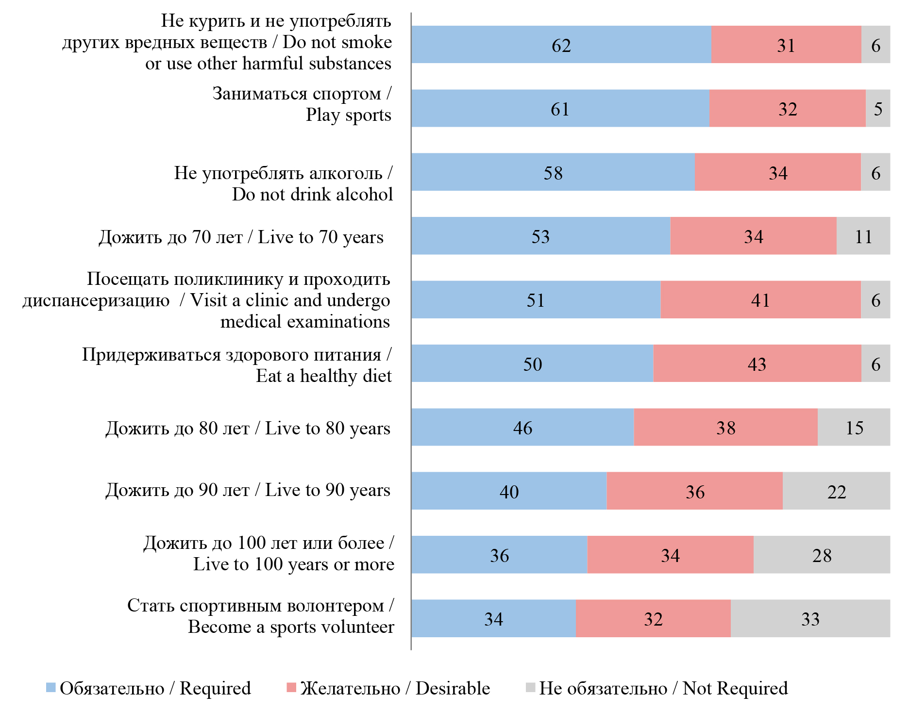 Обязательным в дальнейшем для 62 % становится неупотребление табака и других вредных веществ, для 61 – занятия спортом, для 58 % – отказ от алкоголя (рис. 10). Есть и потенциал спортивного волонтерства – и он не маленький, составляет 34 % – это может быть использовано в практиках и мероприятиях организации добровольческих движений, а также поддержке паралимпийского направления и реабилитации участников спецоперации (это направления, активно развивающиеся в регионе исследования).