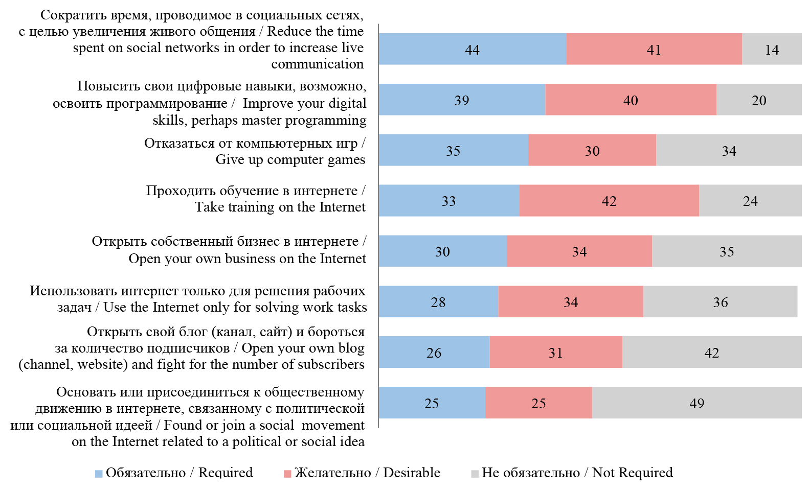 Анализ коммуникативных стратегий показал, что среди молодежи региона преобладает тип, направленный на общение (заинтересованный в нем), но фильтрующий свои коммуникации (43 %), а вот экстравертированность в чистом виде характерна только для 29 %. Еще менее представлен избирательный тип, для которого общение не является целью и ценностью (17 %). Рисковой группой можно считать дефицитный коммуникативный тип, который испытывает определенные трудности в общении и нуждается в поддержке со стороны социализирующих субъектов (3 %). Наиболее значимые выборы у молодых людей следующие: сократить время, проводимое в интернет-общении в пользу живого контакта и больше общаться и заводить друзей, повысить свои цифровые навыки, проходить обучение в интернете, а также отказаться от компьютерных игр (35 %) (рис. 11). Растет количество молодых людей, которые хотели бы открыть свой бизнес в интернете, в 2023 г. таких уже 30 %.