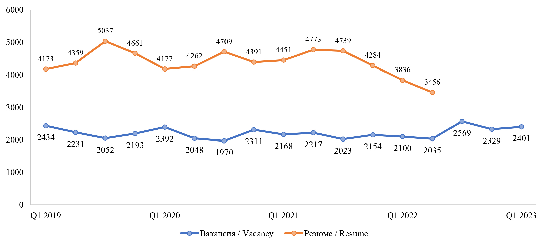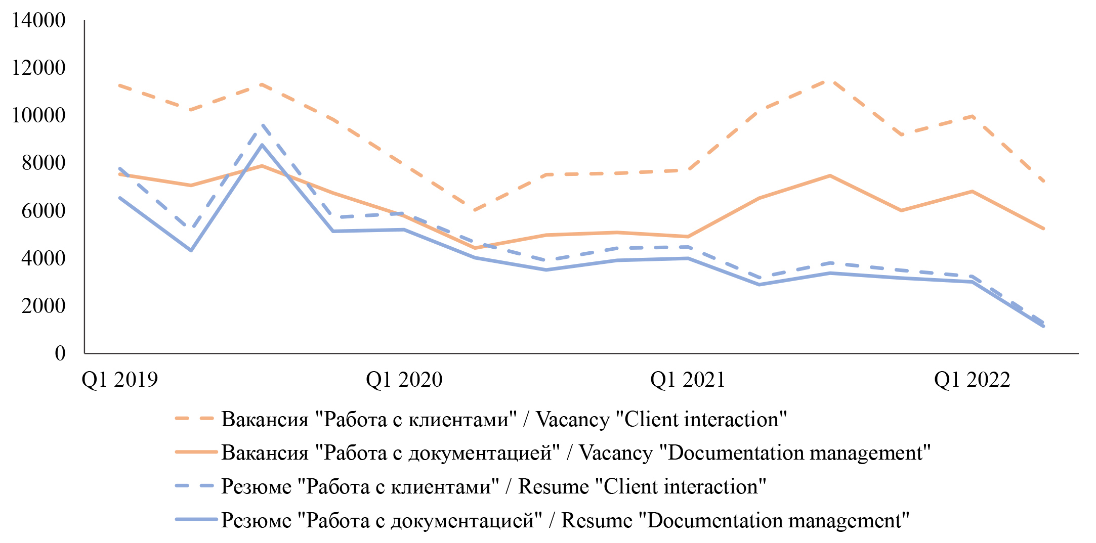 Рис. 6. Динамика упоминаний должностных обязанностей «работа с клиентами» и «работа с документацией» в вакансиях и резюме, 2019–2023 гг.
