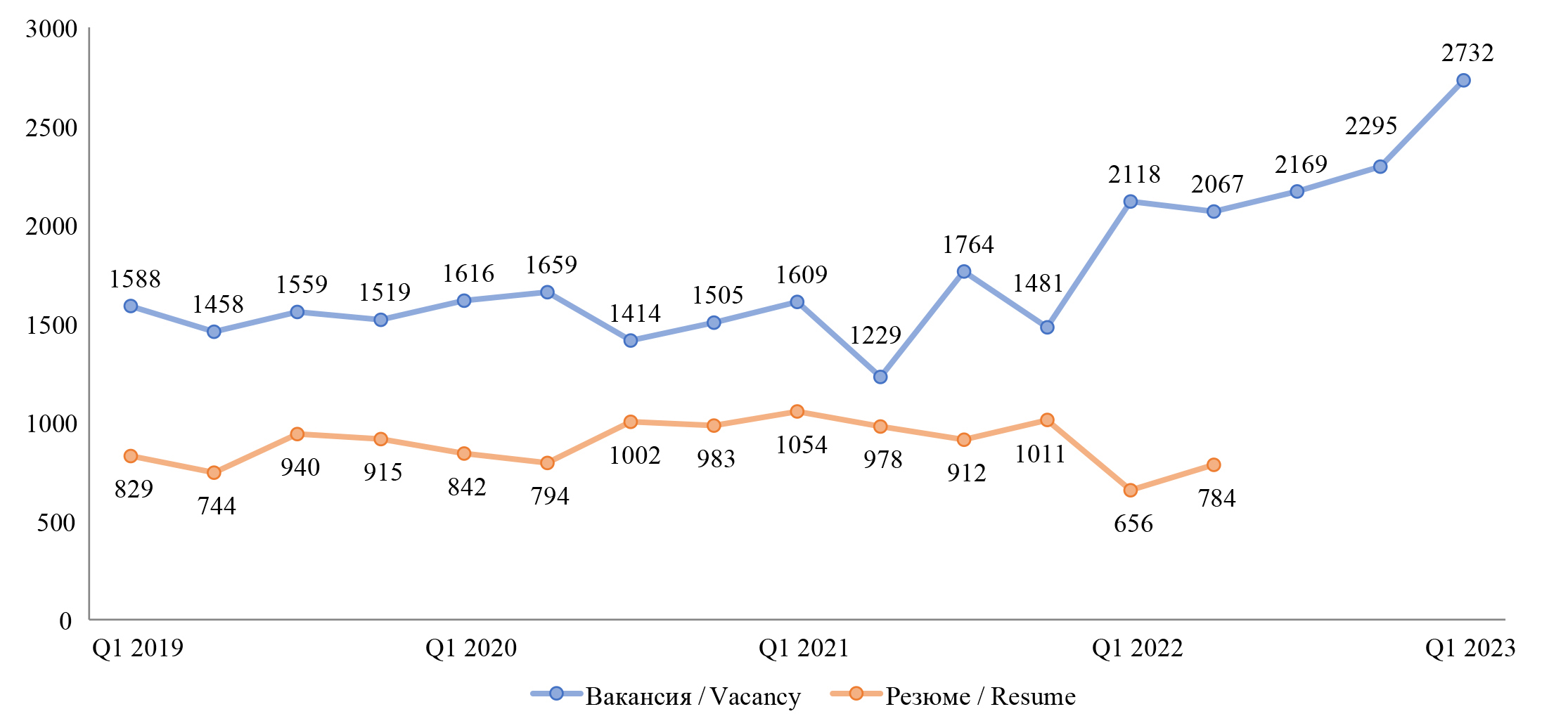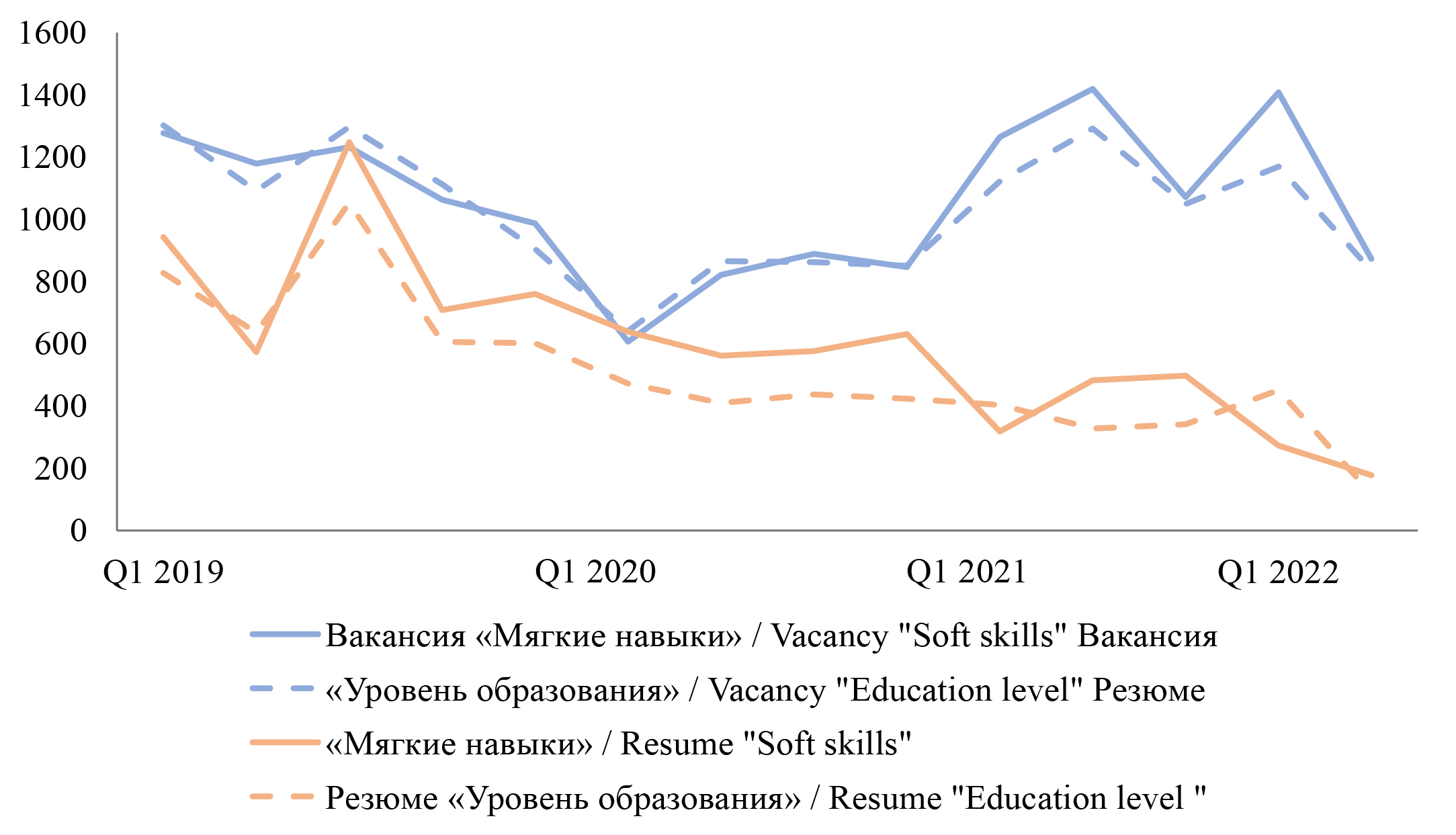 Рис. 8. Динамика упоминаний должностных обязанностей «мягкие навыки» и «уровень образования» в вакансиях и резюме, 2019–2023 гг.
