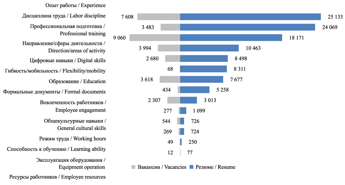 Discussion and Conclusion. The degree of consistency of the requirements of the labor market subjects is analyzed with a focus on the current and future imbalances between the parameters of supply and demand. It is found that the labor market functions under conditions of bounded rationality. Job advertisements fulfill different functions depending on the interpretations of the parties. The parameters of competencies and job responsibilities in the texts of vacancy announcements and resumes do not coincide, which leads to protracted and inefficient processes of candidate selection. The results of the study can be used to develop recommendations for optimizing texts related to job search and personnel selection