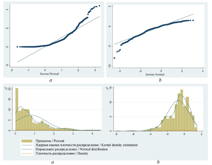 В ходе реализации пространственного подхода были рассчитаны коэффициенты локализации с 2009 по 2020 г. по каждому из 85 регионов России. Для определения порогового значения для показателя «коэффициент локализации» мы опирались на методику Д. Одонохью и Б. Глив. С помощью программного продукта Stata были проведены тесты на нормальность распределения значений. Результаты тестов Шапиро – Уилка и iqr-теста показали, что значения распределены ненормально, существуют мягкие и жесткие выбросы. С целью приближения значений коэффициентов к виду нормальной кривой было принято решение прологарифмировать значения.