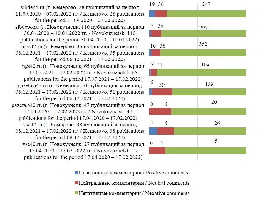 Fig. 2. Analysis of public comments and speeches on the pages of communities in social networks about the transport reform (the number and nature of comments on Kemerovo (June 2018 – February 2022))