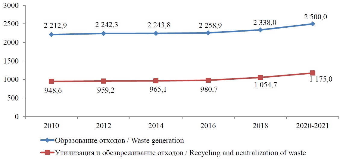 Несмотря на проводимые мероприятия по охране окружающей среды, объем образования отходов в России увеличивается. Согласно данным Федеральной службы государственной статистики Российской Федерации за 20102021 гг., данный показатель вырос почти в 2,3 раза с 3 734,7 до 8 448,6 млн т. При этом утилизируется и обезвреживается около 46 % отходов, остальные отправляются на свалку, образуя накопленный ущерб (рис. 1).