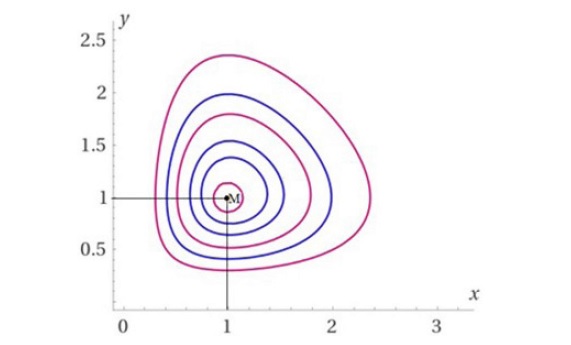 Таким образом, собственные значения якобиана имеют нулевую действительную часть, и мы не можем сделать вывод об устойчивости по первому приближению. Проведем исследование на устойчивость, подобрав функцию Ляпунова. Если удастся показать, что решение устойчиво, то в силу того, что собственные значения имеют нулевую действительную часть, точка равновесия будет центром.