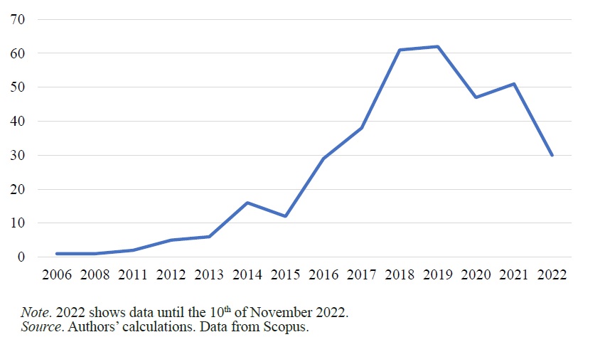 Performance analysis. Number of publications. The first analysis was to examine the development of academic interest in regional entrepreneurship in Russia. We measured this by the number of publications on the topic. We found that studies on entrepreneurship in Russian regions have risen since they first began appearing in Scopus in 2006.