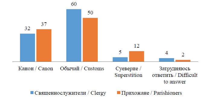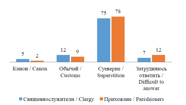 Можно выделить три группы ответов: большинство респондентов относят предложенную для оценки практику к нормативной, но часть полагает, что она регламентируется канонически, часть – церковным обычаем. Вторая группа ответов характеризуется тем, что существенная часть респондентов считает практику нормативной для церкви, но не менее значимая часть интерпретирует ее как ненормативную. Третья группа ответов отражает ситуацию, когда каноническая норма оценивается как суеверие.