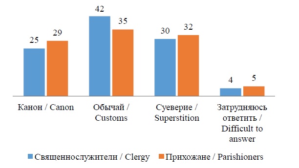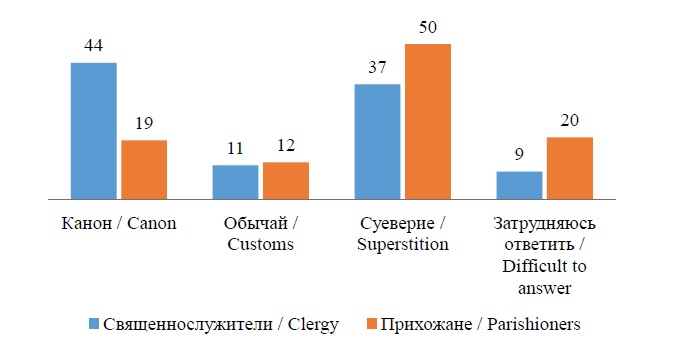 Показательны ответы священнослужителей и прихожан по отдельным вопросам. Первые лучше ориентируются в канонах, обычаях, суевериях как на субъективном, так и на объективном уровнях. Возможно, это связано с профессионализацией их деятельности, поскольку в программу их обучения включаются дисциплины, посвященные изучению церковного права. Прихожане же знакомятся с содержанием канонов через практику и просветительскую деятельность священнослужителей и посредством своего социального окружения.