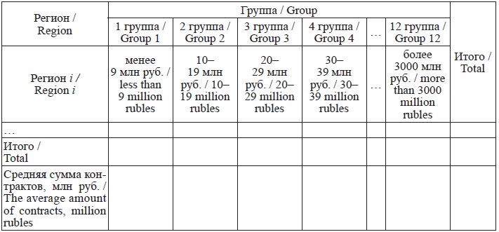 В работе проведена группировка 1 402 контрактов в размере от 1 млн руб. до 3 млрд руб. и выше, заключенных в регионах России (Центральный федеральный округ – 230 контрактов, Северо-Западный – 144, Южный – 163, Северо-Кавказский – 118, Уральский – 162, Приволжский – 270, Сибирский – 181, Дальневосточный – 134). Ввиду того, что мероприятия по охране окружающей среды чаще всего дают отсроченный эффект, в группировку вошли только контракты, заключенные за последние 3 года (2020‒2022 гг.).