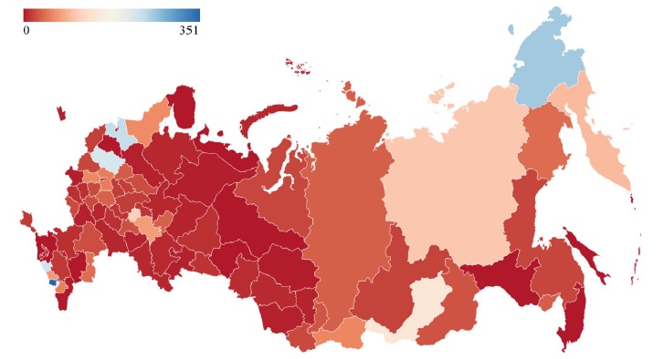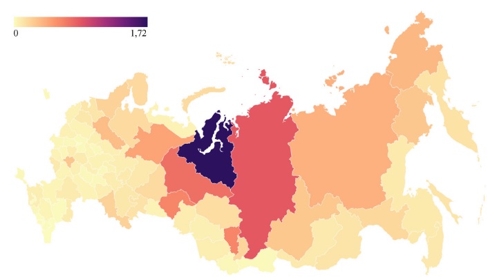Рис. 4. Картограмма показателя «сумма контрактов в расчете на 1 человека,