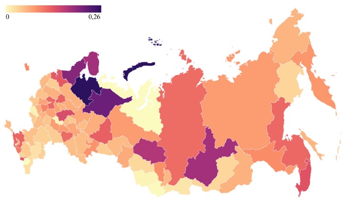 Наибольшая величина сброса загрязненных сточных вод в поверхностные водные объекты выявлена в Архангельской области (0,273 тыс. м3 / чел.), Республике Коми (0,219), Республике Карелия (0,200), наименьшая – в Республике Алтай (0,0014), Республике Ингушетия (0,0017), Алтайском крае (0,0062 тыс. м3 / чел.) (рис. 3). Дифференциация показателей составила 202,3 раза.