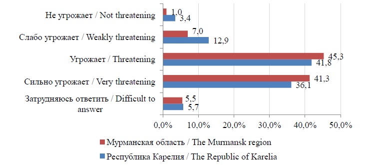 На фоне высокой обеспокоенности по поводу образования незаконных свалок и бытового мусора (рис. 2) выявлены факторы их появления, состоящие в удаленности поселений, недостаточности объектов инфраструктуры по сбору отходов. Опрошенные в Мурманской области чаще выделяли альтернативу «угрожает» (45,3 % в Мурманской области и 41,8 % в Республике Карелия) и «сильно угрожает», чем в Республике Карелия (41,3 против 36,1 %).