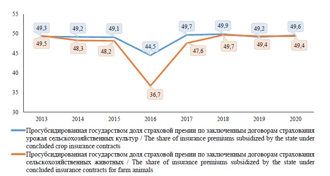 Показатели свидетельствуют о значительном перевыполнении плановых значений застрахованных посевных площадей по договорам страхования в растениеводстве в 2013–2014 гг. на уровне 130,8 и 142,5 % соответственно. В 2015 г. наблюдалось недовыполнение плана на 9,2 %. В годы реализации единого субсидирования (2016–2018 гг.) объем застрахованных посевных площадей динамично сокращался, что влекло за собой невыполнение даже заниженных плановых показателей вплоть до 17,0 % в 2018 г. В 2019 г. после реформирования единой субсидии началось восстановление сельскохозяйственного страхования и план был выполнен на 56,0 %. В 2020 г. положительная тенденция продолжилась: выполнение плана по доли застрахованных посевных площадей составило 65,0 %.