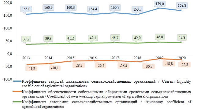 За исследуемый период произошло улучшение показателей финансовой устойчивости сельскохозяйственных организаций (рис. 7). Так, значение коэффициента текущей ликвидности сельскохозяйственных организаций увеличилось с 155,0 % в 2013 г. до 168,8 % в 2020 г.