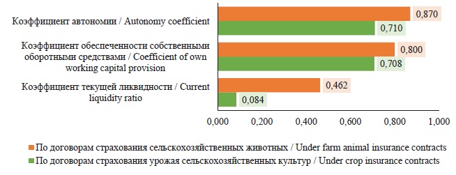 Результаты корреляционного анализа величины страхового покрытия (страховой суммы) и финансовой устойчивости застрахованного товаропроизводителя (рис. 10) показывают высокую связь величины страховой суммы по договорам страхования сельскохозяйственных культур с коэффициентом обеспеченности собственными оборотными средствами (0,708) и коэффициентом автономии (0,710) при полном отсутствии связи с коэффициентом текущей ликвидности (0,084). Также высокая связь наблюдается между величиной страховой суммы по договорам страхования поголовья сельскохозяйственных животных с коэффициентом обеспеченности собственными оборотными средствами (0,800) и коэффициентом автономии (0,870) при среднем значении уровня связи с коэффициентом текущей ликвидности (0,462).