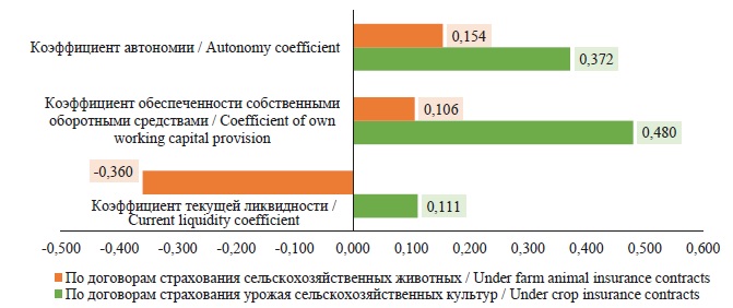 Проведенный анализ свидетельствует о высокой связи между страховыми выплатами и финансовыми результатами деятельности производителей в отрасли растениеводства. В отрасли животноводства данное воздействие выражено в гораздо меньшей степени. При этом выявлена высокая зависимость между уровнем страховой защиты (страховой суммой) и финансовыми результатами производителей в отрасли животноводства и крайне низкая связь в отрасли растениеводства. Сельскохозяйственное страхование с государственной поддержкой в контексте охвата страховым покрытием (величины страховой суммы) оказывает значительное влияние на уровень финансовой устойчивости производителей отрасли растениеводства и животноводства. В то же время связь между финансовой устойчивостью производителей сельскохозяйственной продукции и полученным страховым возмещением можно охарактеризовать как умеренную.