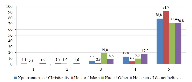 Сопоставляя ответы, определяющие ценность работы с аналогичным вопросом о значимости семьи (рис. 2), важно подчеркнуть очевидную доминанту выбора позиции «5 баллов» для представителей всех подгрупп выборки. Расчет среднего арифметического значения по вопросам, касающимся ценности семьи и работы, выявил, что для всех изучаемых категорий респондентов характерна важность семьи относительно работы: средний балл у представителей христианства 4,29 (работа) против 4,66 (семья), у представителей мусульманской религии – 4,33 и 4,86, у представителей иных конфессий – 4,33 и 4,42 и у неверующих – 4,30 и 4,53 соответственно.