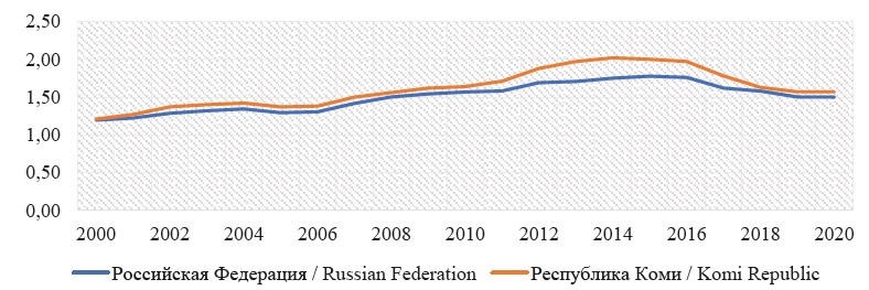 Рис. Суммарный коэффициент рождаемости в России и Республике Коми, 2000–2020 гг.18