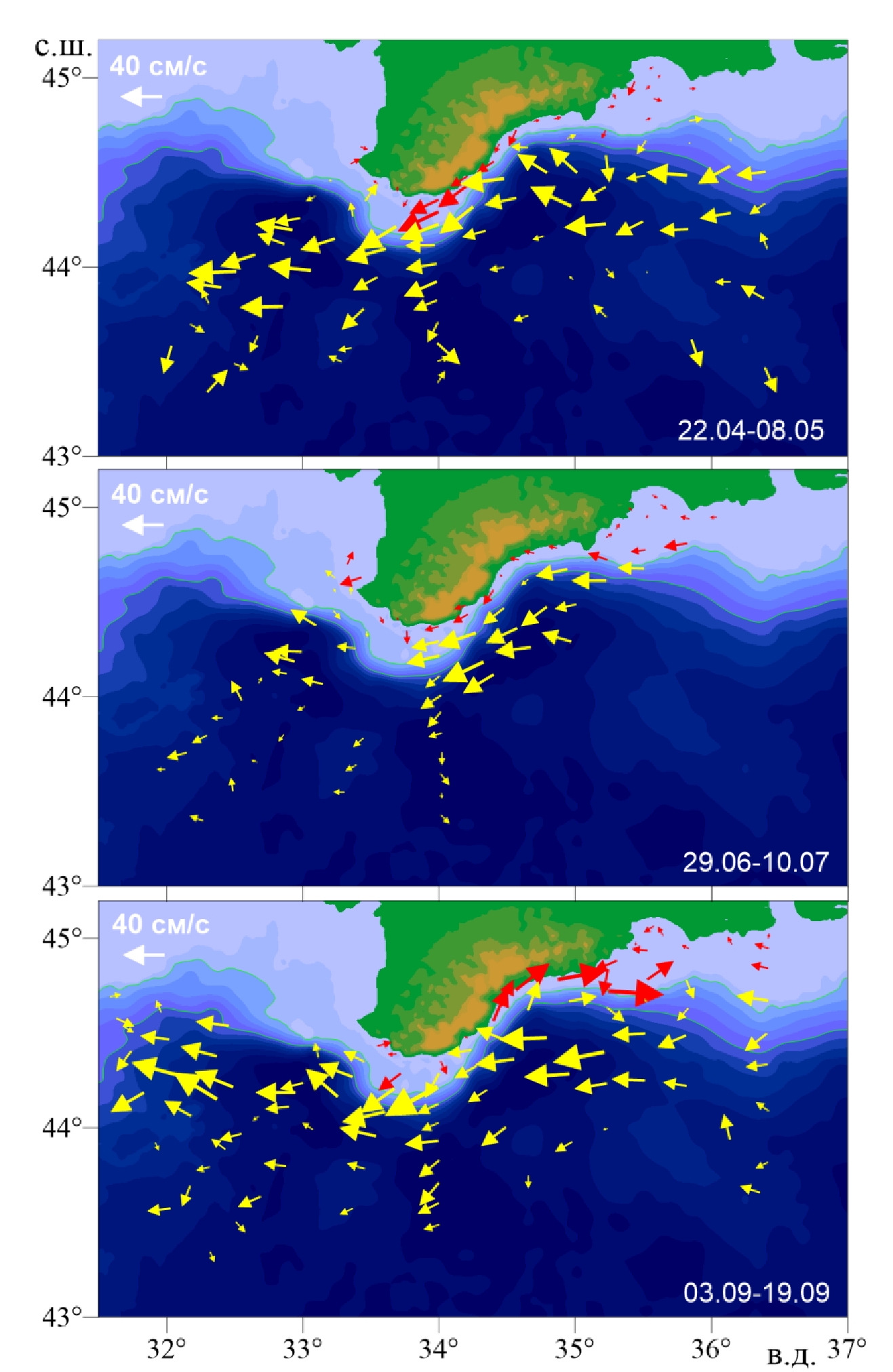 In the spring expedition, the horizontal distribution of currents revealed an anticyclonic mesoscale eddy (the Crimean anticyclone) with the typical scale of ~40 km in the eastern part of the polygon. In the autumn expedition, a powerful alongshore current at a velocity of up to 40 cm/s was observed by the Southern coast of Crimea in the nearshore shelf zone. It was moving in the direction opposite the intense Rim Current (30–40 cm/s) and maintained its direction throughout the whole water column.
