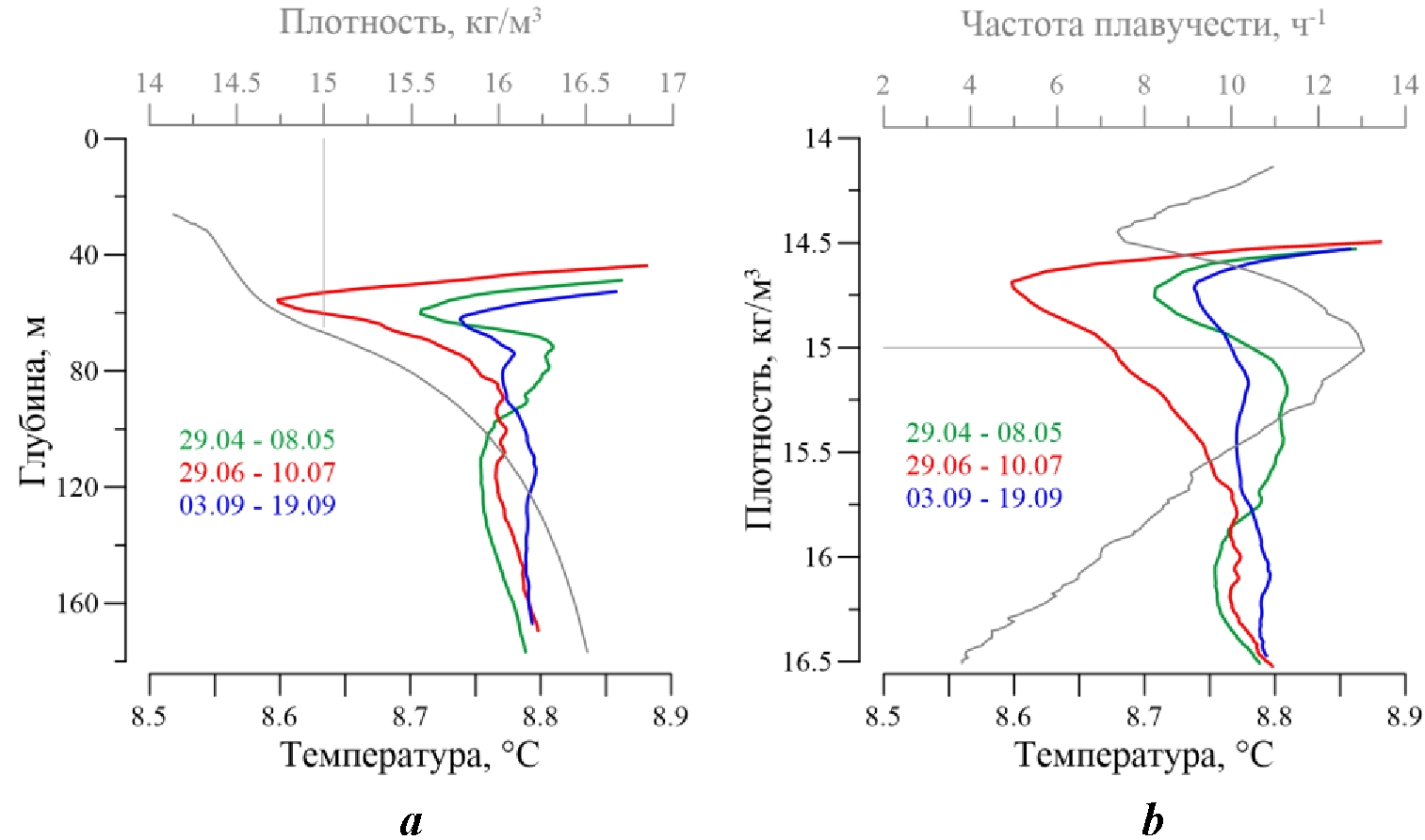 4. Fig. 3. Temperature vertical profiles isopicnically averaged over the set of 2021 expedition stations, together with the density distribution (a) and buoyancy frequency (b). The temperature scale is limited above by the value of 8.9 °С
