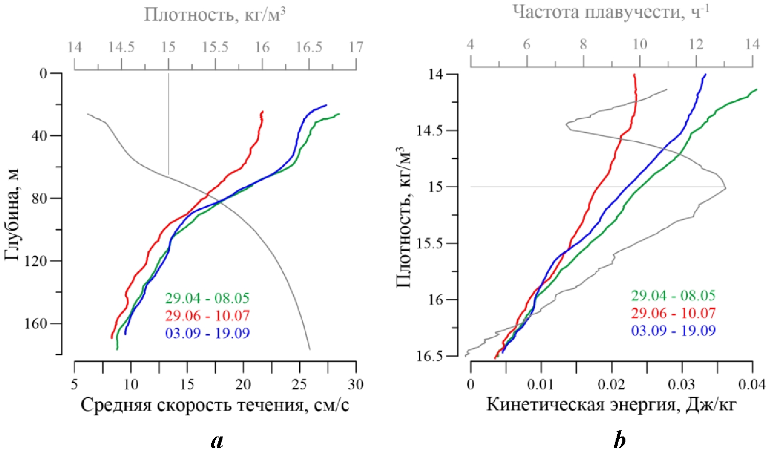 The root mean square (RMS) profile of the current velocity modulus in all seasons shows its decrease with depth (Fig. 4, a). At the same time, in the 30–100 m depth range, the values of the current velocity modulus in spring and autumn were higher than in summer when large-scale sea circulation weakens and a seasonal thermocline is formed. Up to a density value of 14.5 kg/m3 corresponding to the minimum buoyancy frequency, the current velocity varied slightly. In the 40–100 m depths layer (14.5–16.0 kg/m3 density range), there was a sharp (almost twofold) decrease in the current velocity modulus caused by the transition of a part of kinetic energy into potential one, determined by the isopycnic surfaces deviation from the horizontal position.