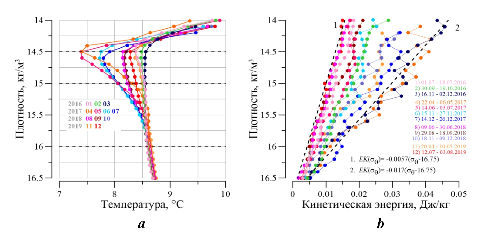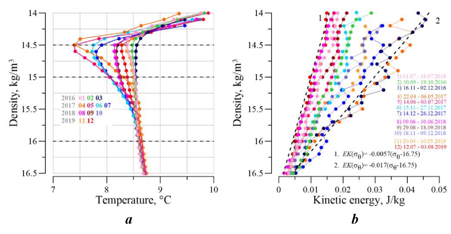 6. Fig. 5. Vertical profiles of temperature (a) and kinetic energy (b), isopycnically averaged over the set of stations, for 12 expeditions of 2016–2019