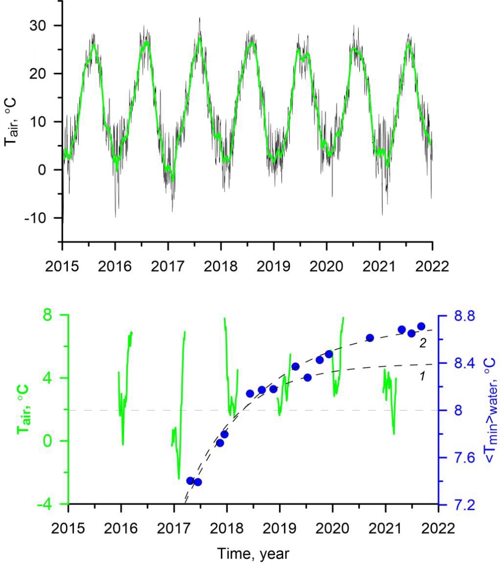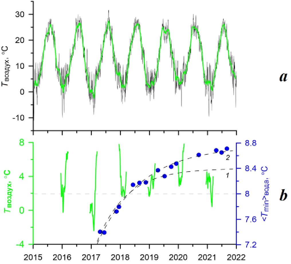7. Fig. 6. Mean daily (grey line) and mean monthly (green line) air temperature in Kerch (a), mean values of the minimum water temperature in the profiles at the stations for the 2017–2021 expeditions and mean monthly winter air temperature in Kerch (b). Lines 1 and 2 are approximating functions