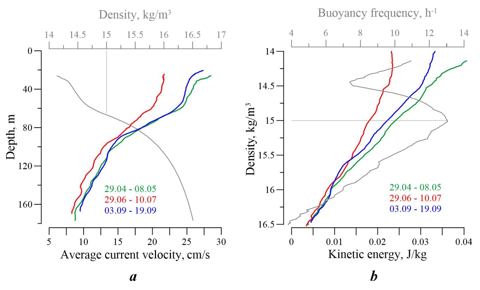 A decrease in kinetic energy of the upper layer in summer and its increase in spring and, especially, in autumn were well traced in the vertical profiles. These profiles can be approximated by linear relationships that cross the zero value at a density of 16.75 kg/m3. Similar results were obtained according to the data of the 2016–2019 expeditionary research. The values of kinetic energy in the upper layer of the sea (at a density of 14 kg/m3) in summer did not exceed 0.02 J/kg, according to all the measurements carried out in 2016–2021.