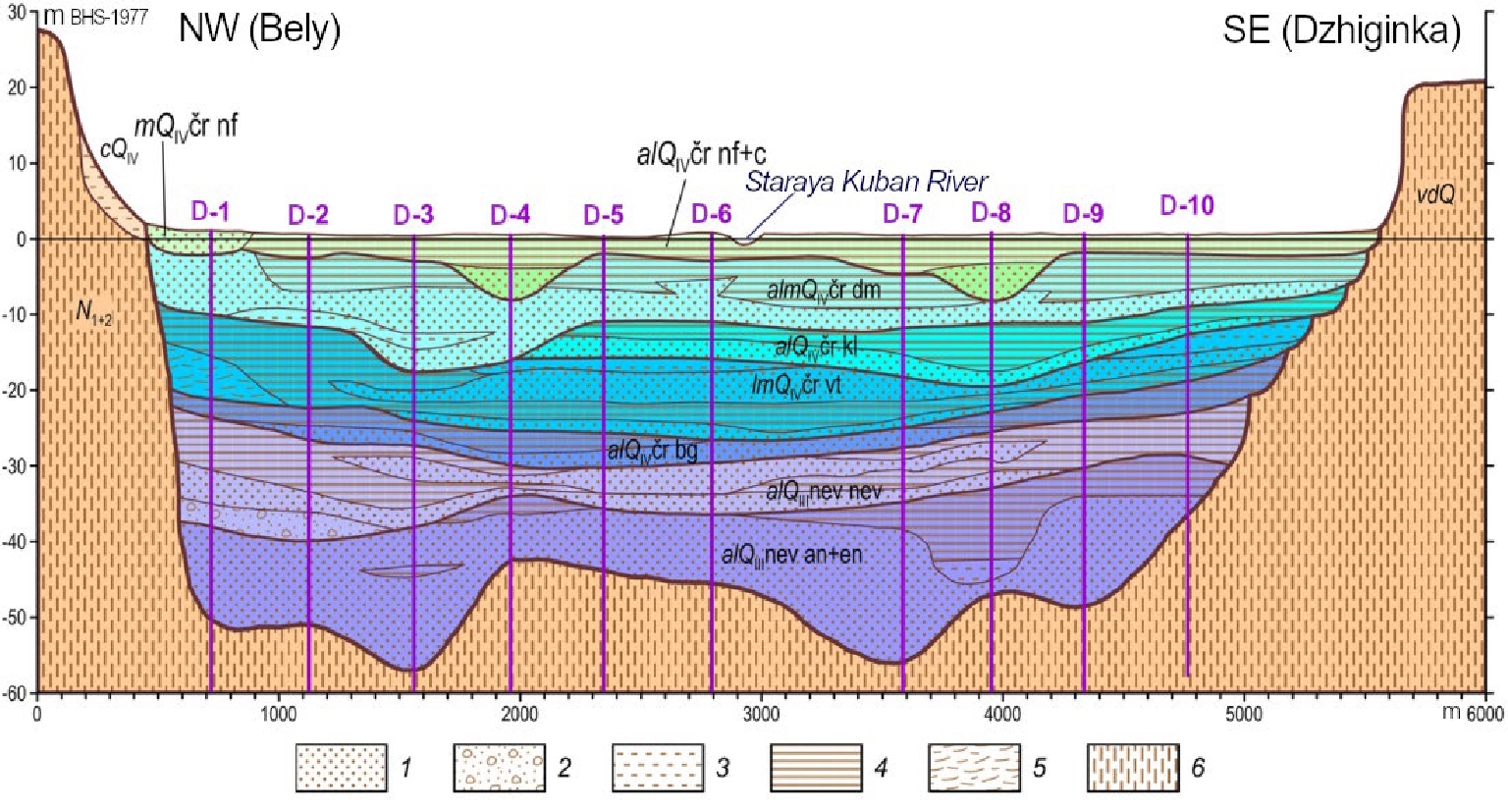 Fig. 2. Dzhiginsky geological profile across the Staraya Kuban River (adapted from [29, p. 82]). Lithological composition: 1 – sand; 2 – sand with pebbles; 3 – siltstone; 4 – clays; 5 – silts; 6 – loess. Genesis: a – river; l – lagoon; m – marine; v – eolian; d – slope; c – landslide. Age: N1+2 – Neogene; Q – Quaternary; an+en – Antsky-Yenikalsky; nev – Novoevksinsky horizon; nev nev – Novoevksinsky layer; QIVčr – Black Seahorizon; bg – Bugazsky; vt – Vityazevsky; kl – Kalamitsky; dm – Dzheme-tinsky; nf – Nymphean, modern; D-5 – well numbers