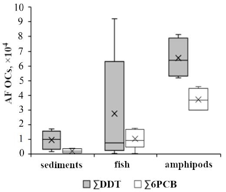 According to the OCs data in water, sediments and hydrobionts of the Salgir, the accumulation factor (AF) in sediments and bioaccumulation factor in hydrobionts (BAF) were calculated using the following formula: AF(BAF) = Cs(h),g/Cw·1000, where Cs,h – concentration of OCs in sediments or in tissues of hydrobionts (ng/g); Cw – concentration of OCs in water (ng/L). 6)