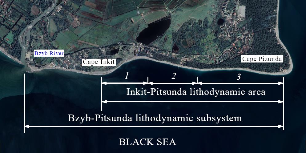 Based on the influence of the coastline configuration (Cape Inkit extending into the sea) on the longshore sediment flow, the Bzyb-Inkit and Inkit-Pitsunda lithodynamic areas can be distinguished in the identified Bzyb-Pitsunda lithodynamic subsystem. Taking into account the configuration of the coastline, three lithodynamic sections can be distinguished within the Inkit-Pitsunda lithodynamic area (Fig. 2):