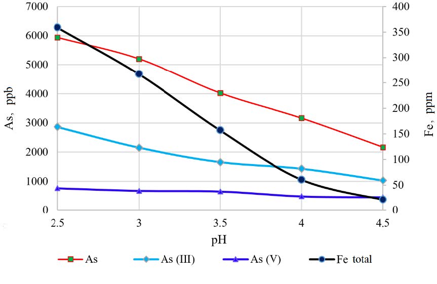 To further investigate the ability to release iron and arsenic in an acidic medium under real conditions, the authors conducted experiments at pH values from 4.5 to 2.5. The course of the experiment was the same as under seepage conditions: 120 mL of aqueous phase with the above composition was added in a pre-stored solution. A 4 M HCl solution was used to adjust the pH value of the water before each wash through the column and 20 mL of sample was taken for analysis. The above procedure was repeated (pH adjustment for five days and sampling).
